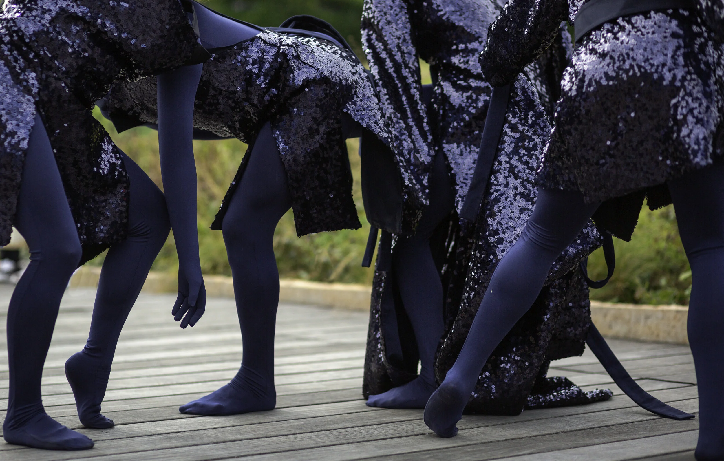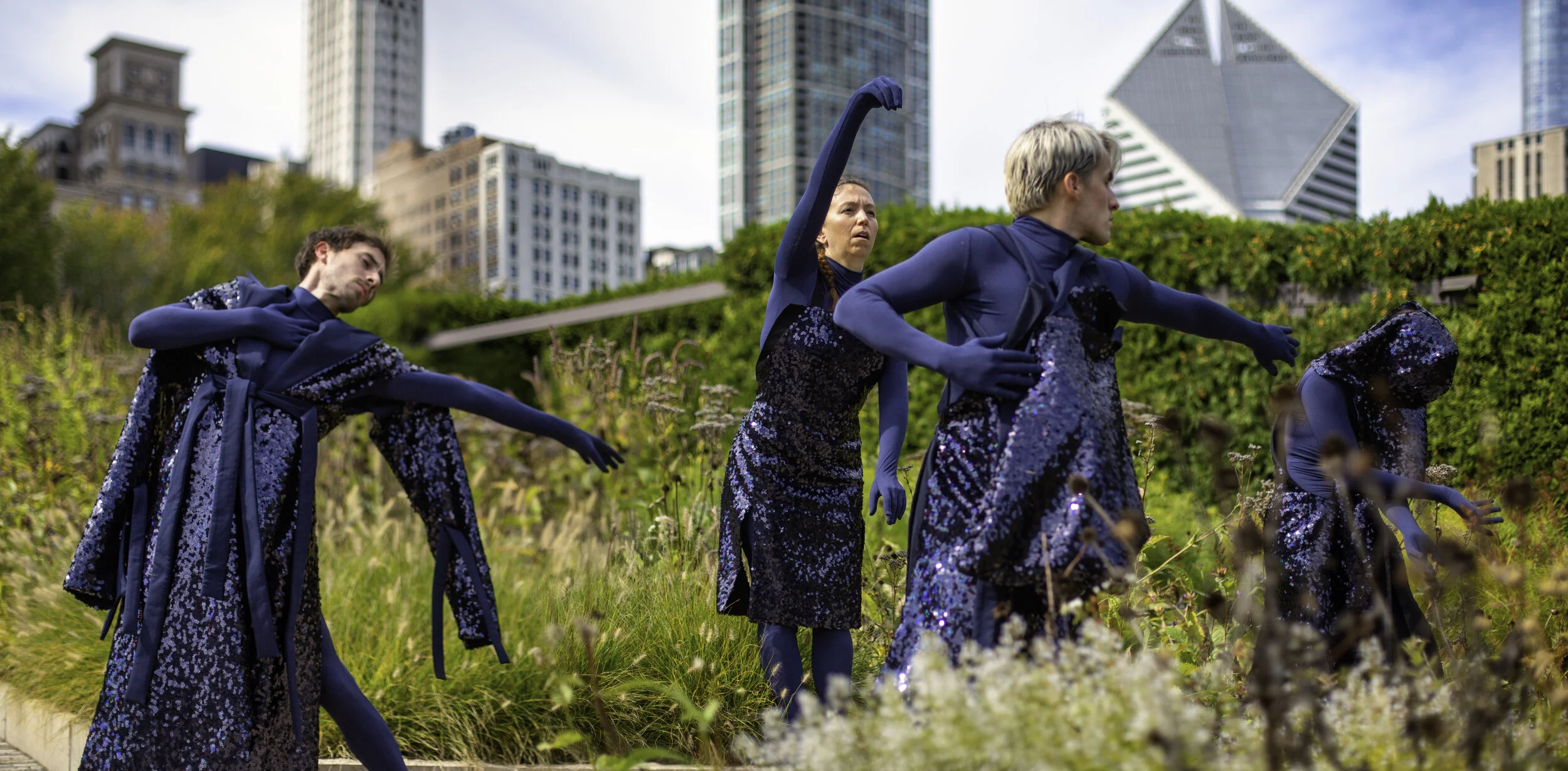Initiating the project in the Lurie Garden within the City of Chicago’s Millennium Park, Fernandes’ performative intervention brings together a group of dancers in acts of utilitarian choreography. The movement of the dancers, informed by practices of tending, foraging, and propagating, positions an ethos of sustainability within its score. In response to the garden itself, designed by Dutch landscape architect Piet Oudolf, the visual aspects of the work are rooted in the needs of its maintenance, which is determined by human hand as much as it is by natural process. As a perennial landscape, the often-preferred manicured aesthetic of North American public space is replaced by the ecologically beneficial—while far from wild, the Lurie Garden presents the illusion that it exists without the interference or involvement of people. This underlying fantasy, a type of camouflage of labor, underscores the original aims of The Four Seasons ballet works; from the predominant use of plant forms in the costumes of Robbins’ 1979 performance, to the recollection of Russian prima ballerina Anna Pavlova holding strings of dark blooms as a Bacchante in Les Saisons, or Noguchi’s angular set design that transformed the figures of the dancers into equal elements of geometry. In each performance, the aim was for the dancers to disguise into the backdrops of their stage—literally becoming one with their environment. In 72 Seasons, this sense of camouflage takes on new meaning with costume design developed in collaboration with Rad Hourani, who contributed to Fernandes’ 2020 installation Contract and Release at the Noguchi Museum in New York.